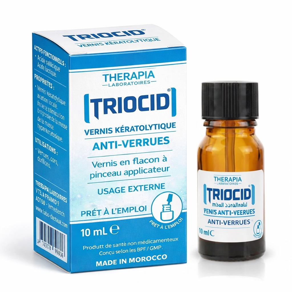 TRIOCID® est un vernis kératolytique associant l’acide salicylique et l’acide lactique à un système filmogène volatil pour usage topique. Cette combinaison permet une action locale ciblée, favorisant l’élimination progressive de la masse hyperkératosique.